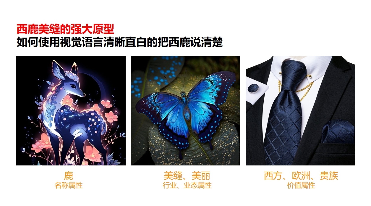 西鹿強大原型的品牌價值表達拆解=“鹿”代表名稱屬性+“美縫的美麗”代表行業(yè)和業(yè)態(tài)屬性+“西裝領(lǐng)帶”代表西方的價值屬性